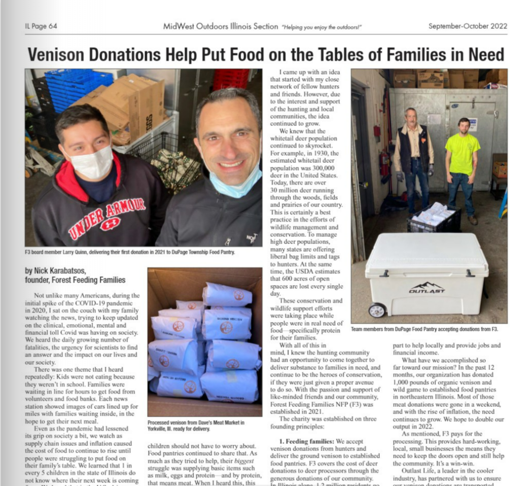 Special thanks to Larry Ladwoski and the Midwest Outdoors team for featuring Forest Feeding Families in their September-October, Fall issue! The entire team at Midwest Outdoors is very passionate about supporting the communities they serve. We appreciate you allowing us to share the great work our team is doing. Check us out on page 64 of the Illinois edition!